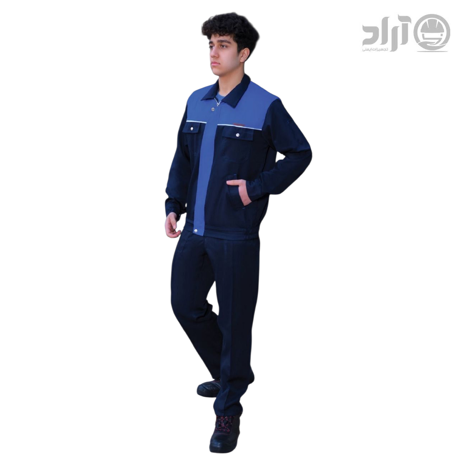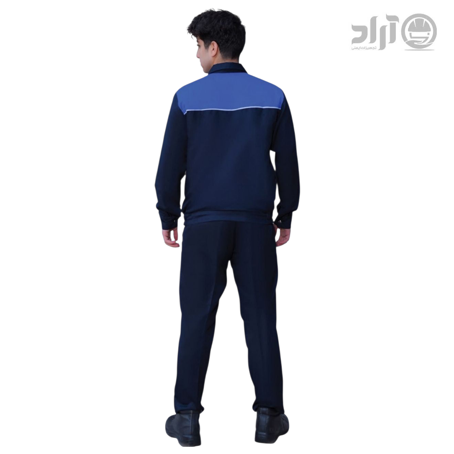 این لباس با طراحی مدرن و رنگ‌بندی حرفه‌ ای سرمه‌ ای و آبی، ظاهر کارکنان را مرتب و سازمان‌ یافته نشان می‌ دهد و حس اعتماد به نفس و انگیزه را در طول روز کاری افزایش می‌ دهد.