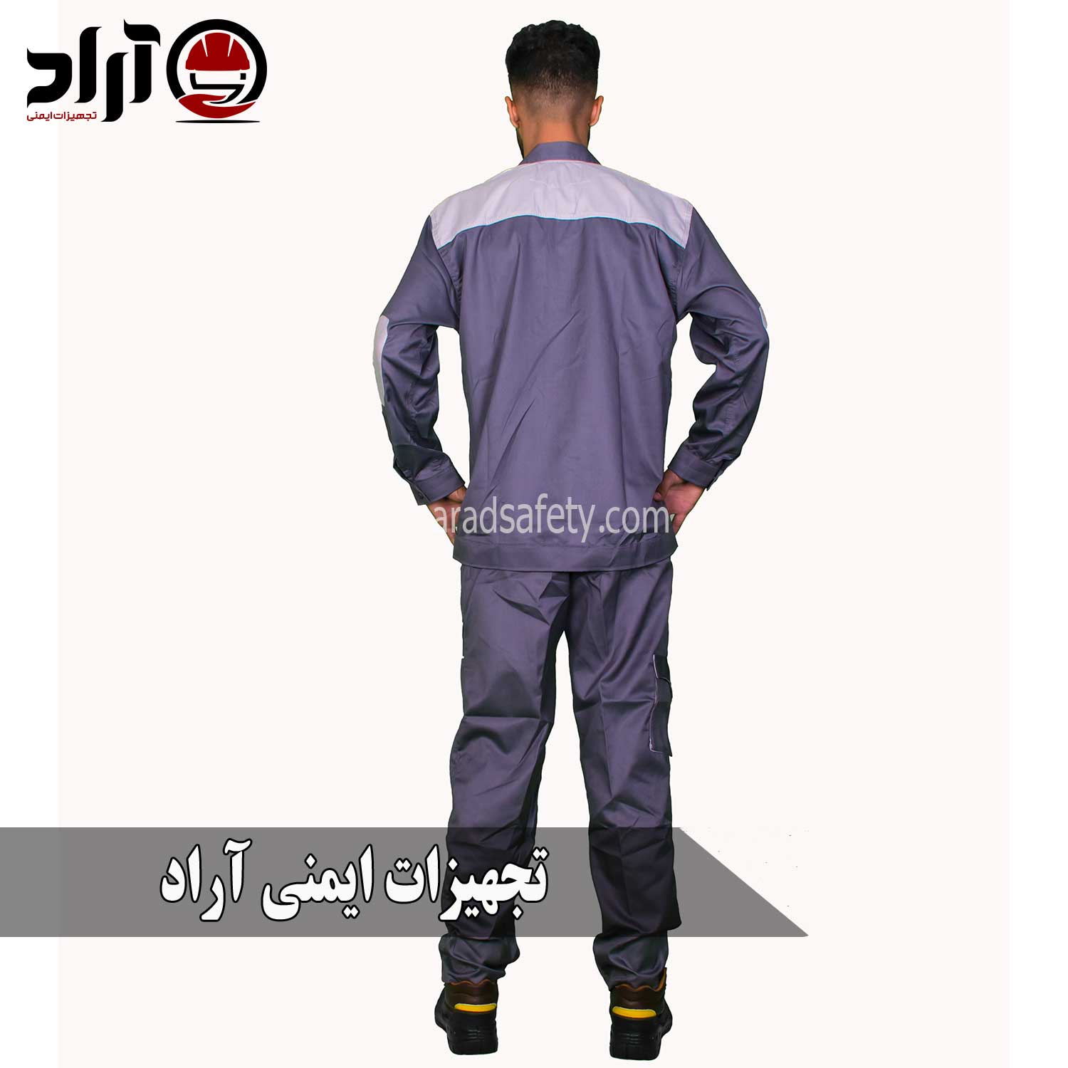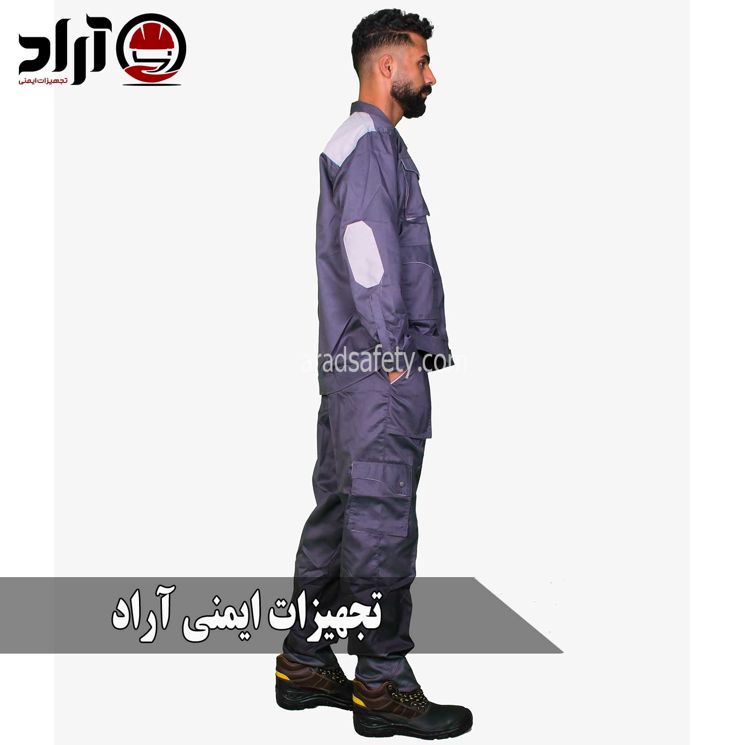 این لباس کار با ترکیب رنگ طوسی و خرج کار استخوانی، ظاهری شیک و کاربردی دارد که برای محیط صنعتی و کارگاهی ایده آل است.