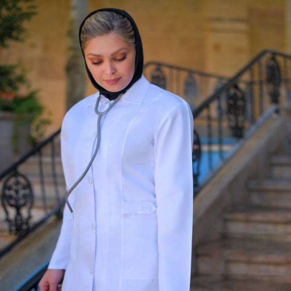 مانتو هلیا سفید با پارچه ترگال کجراه و دوخت دقیق، استایلی حرفه ای و پوششی راحت را برای کادر درمانی و اداری فراهم می کند.