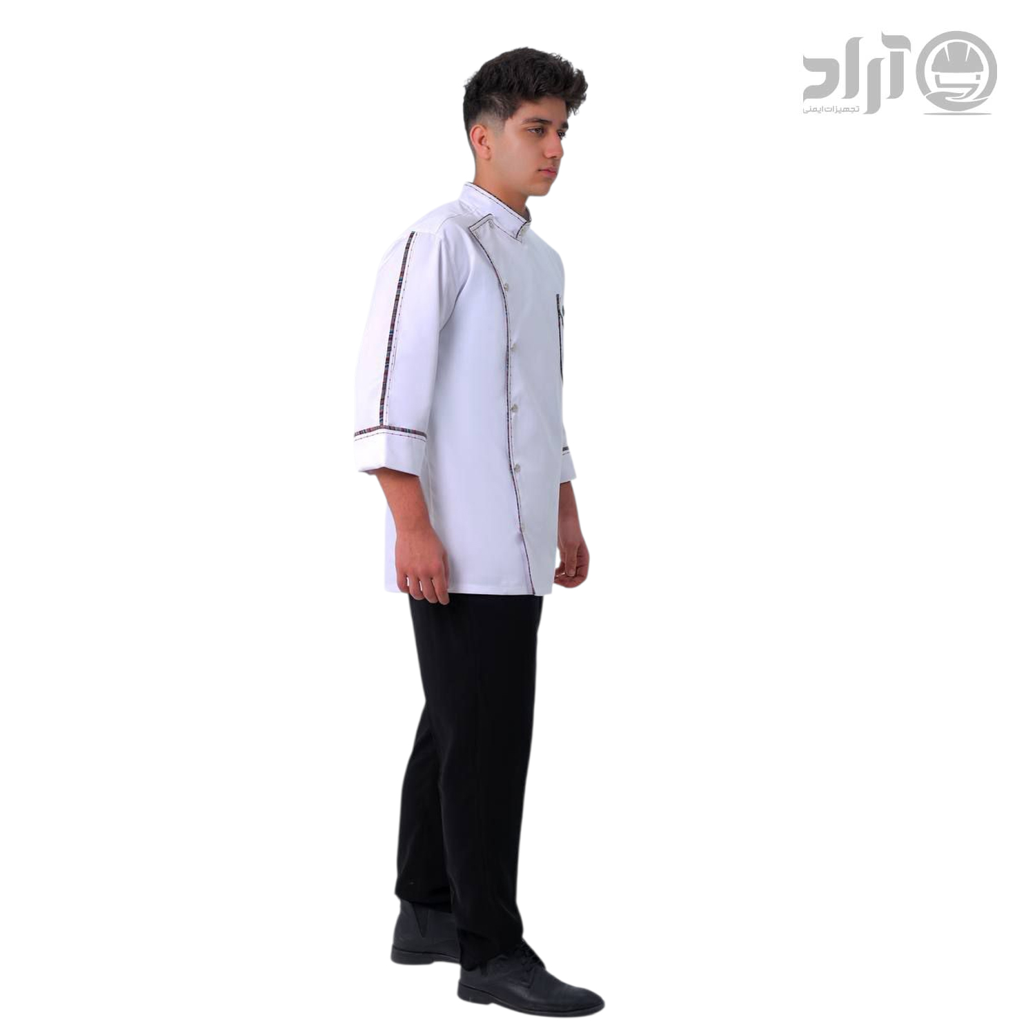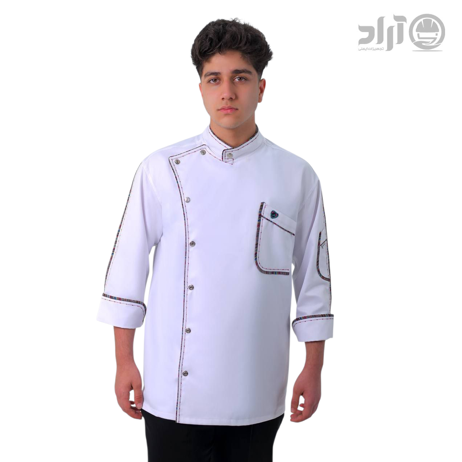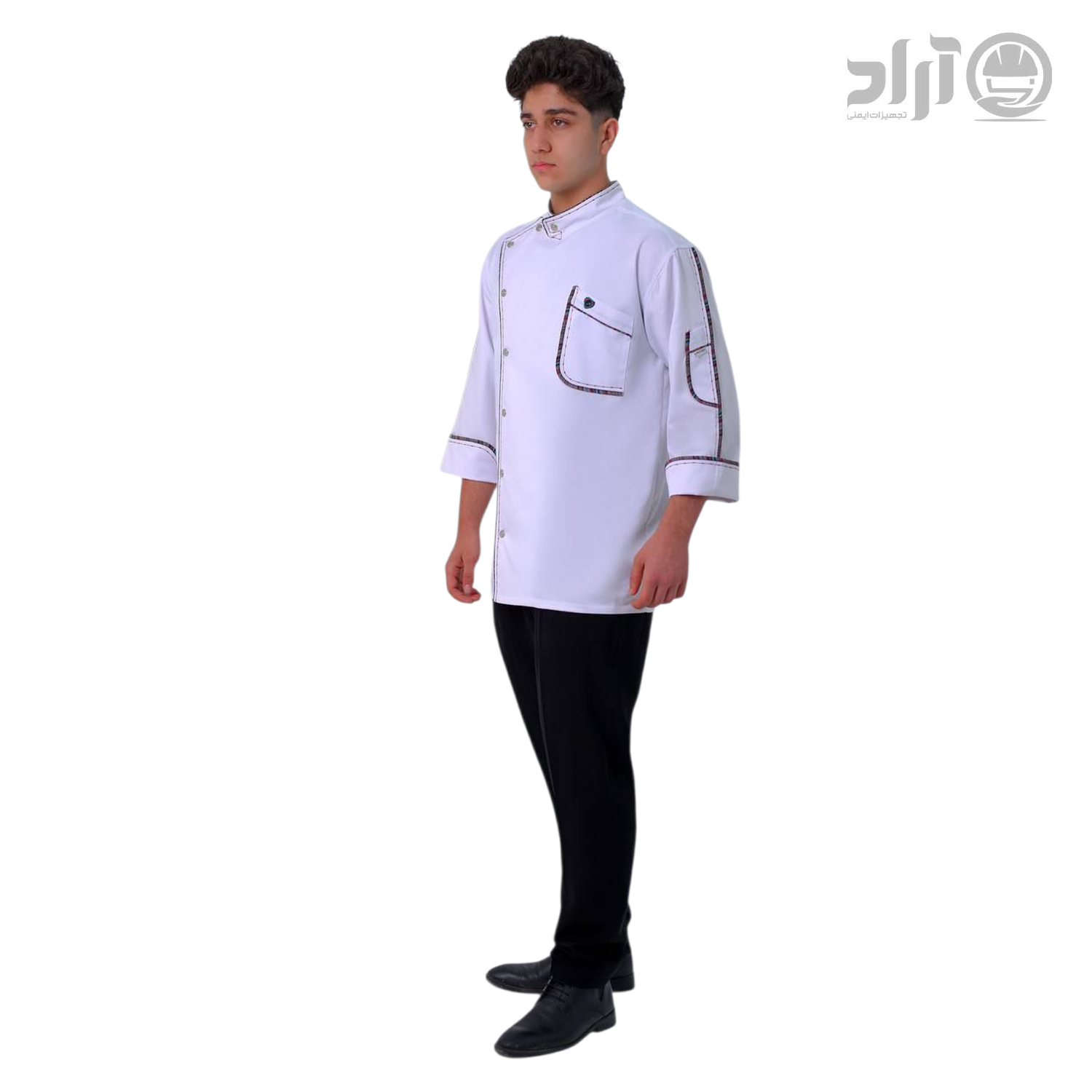 روپوش هیراد سفید با پارچه کجراه مقاوم و دوخت فول اتوماتیک، نماد نظافت، دقت و استاندارد های بالای بهداشتی برای محیط های حساس مانند قنادی ها و رستوران های لوکس است.